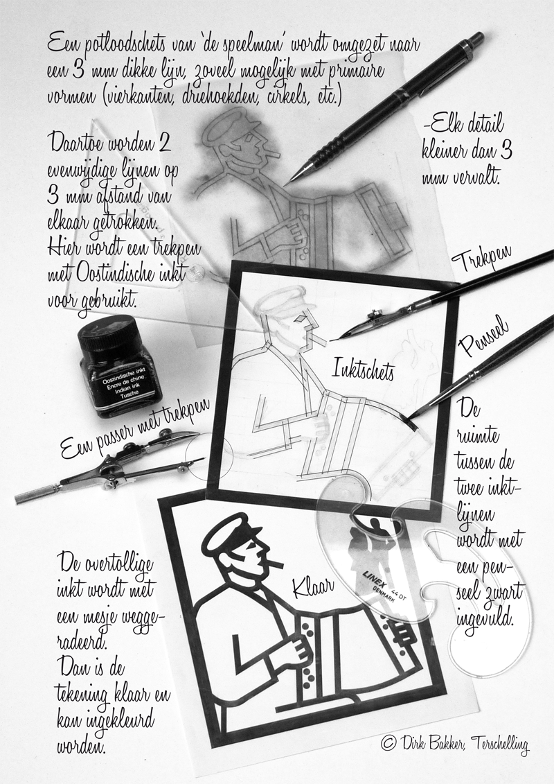Fietsend over het eiland maakte Dirk schetsen en thuis op de tekentafel werkte hij ze uit met behulp van linealen, mallen, trekpen, passers en Oostindische inkt. Er waren toen nog geen computers met geavanceerde tekenprogramma’s. De tekeningen moesten aan de volgende criteria voldoen: